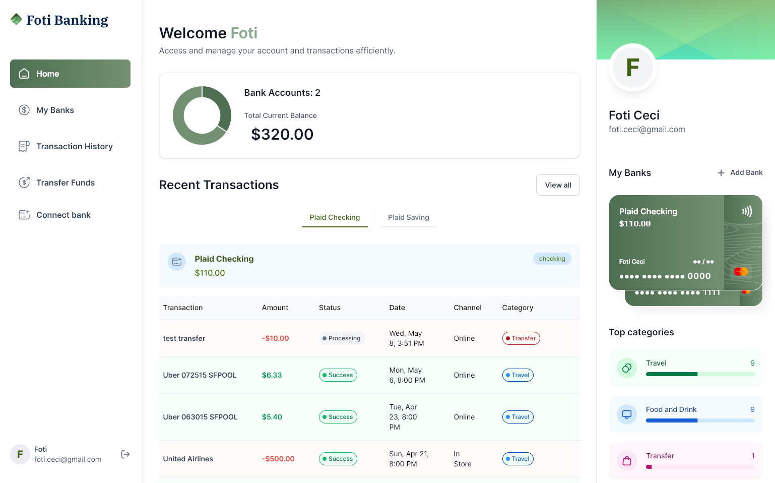 Built with Next.js, Foti Banking is a full stack financial platform that connects to multiple bank accounts, displays transactions in real-time, allows users to transfer money to other platform users, and manages their finances altogether.